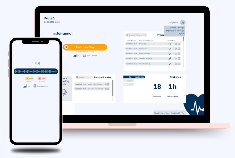 Our journey began at HealthX, an incubator by Helsinki University, Helsinki Think Company, and the City of Helsinki, where we refined our idea with expert mentorship. Recognized for our innovation, we were accepted into DigitalWell Ventures, a Scandinavian accelerator supporting Nordic tech startups. With a team of clinicians and AI-driven developers, we built a tool that allows healthcare professionals to focus on patients, not paperwork. Our mission is clear—join us in creating a more sustainable healthcare system.